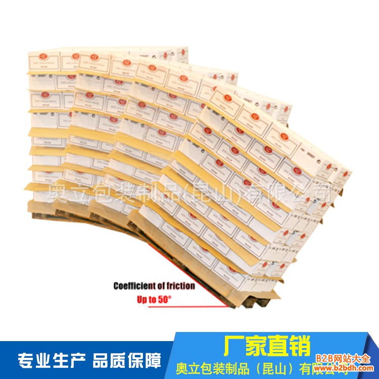 托盘防滑纸是奥立公司续滑托板后又成功开发研制的一种纸张。它可安插在货物和托盘之间,起到防滑和保护产品的作用,放置货物在搬运过程中的滑落或倒塌,使托盘堆垛始终保持整洁美观,减少货物损坏的几率。本品主要用作托盘中间的垫层,货物的层与层之间各放入一张防滑纸,如此阻止了袋子或纸箱的滑动。可有效消除货物在运输过程中的转弯、急刹。加速时产生的力。摩擦系数非常高,正常情况下可保证货物倾斜45度角时不倒塌,最高可达到60角度。优势