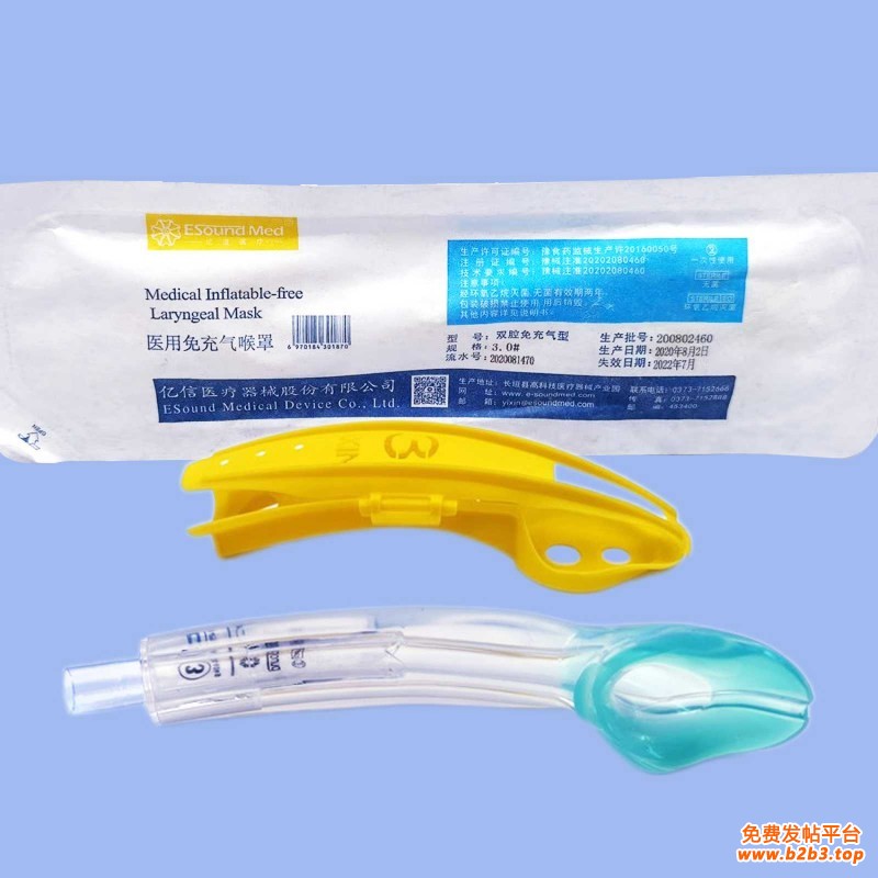【使用方法】 选择合适的型号,检查喉罩是否有明显的缺陷或锋利边角。 在喉罩背部涂少量可溶于手的润滑剂,一手以握笔式夹住喉罩。 将病人的口张开,置喉罩的背部部于前侧牙齿的后部。 将产品的柔软沿硬腭、软腭向后顺序进入,持续沿头颅方向向后压至下咽部部位直到感觉有特征阻力为止(提示到达上气管括约肌)。 从上颌前两侧用胶带固定好喉罩。 喉罩拔出 直接拔出医用免充气喉罩