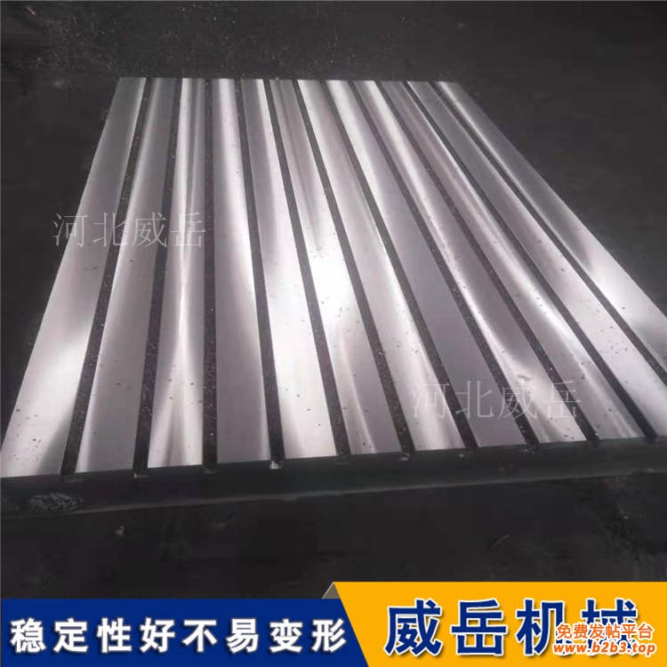 铸铁T型槽平台精度平板制成筋板式和箱体式,工作面有长方形、正方形或圆形。工作面采用刮削工艺,工作面上可加工V形、T形、U形槽和圆孔、长孔等。铸铁检验平板、铸铁划线平板、铸铁铆焊平板、铸铁装配平板、动力机械震动试验台(又称槽铁或地梁、地轨)、铸铁方箱、检验棒、V型铁、花岗石平板(石平板)以及其他石量具划线平台、铆焊平台、试验平台、装配平台、检验平台、大理石平台、铸铁工作平台组合拼装T型槽平板、铁地板,检验、划线装配、铆焊、工装用平板,镗铣床平台,三座标仪平板,模具垫板,实验室基础平板,槽铁(地轨)、方(垫)箱机床工作台、震动实验台、基础平台、落地工作平台、检测平台、划线平台、装配平台、铆焊平台、组合平台材质为强度(HT200~300). 工作面硬度HB170~240.经过两次时效处理(人工时效及自然时效2~3年).使该产品的精度稳定而抗磨性好.精度按国家标准计量检定规定规程执行.平台 (按GB4986-85制造)划线、检验、测量、铆焊、装配、焊接用工作平台 工作面精度一般为1级。